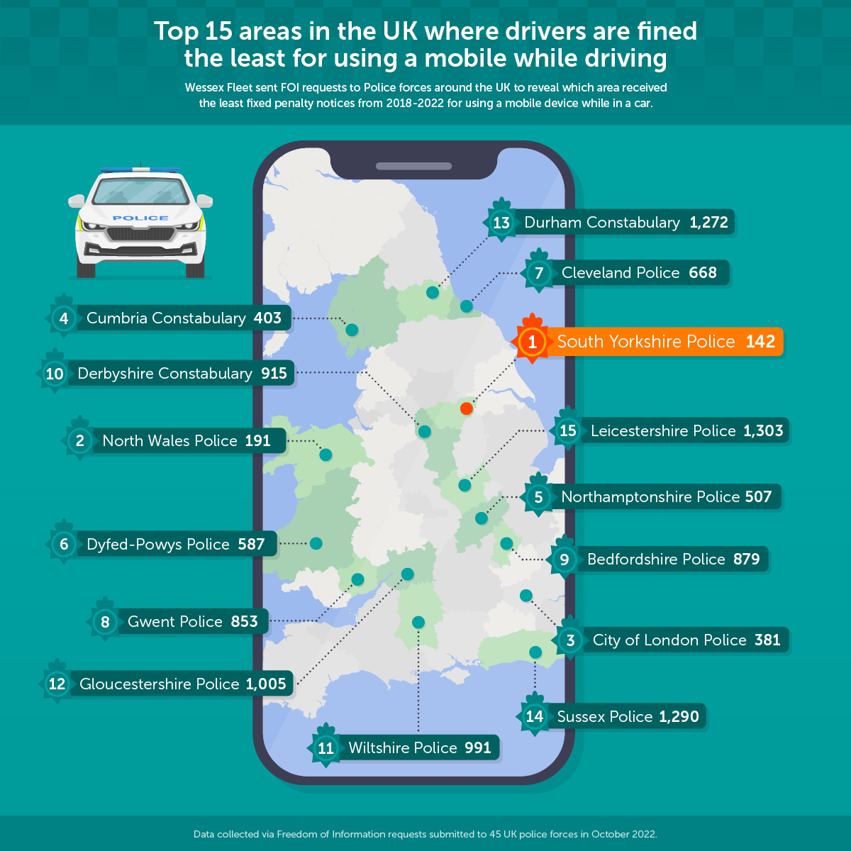 Wessex Fleet sent Freedom of Information requests to all 45 police forces in the UK to ask for data on how many drivers have been caught using a mobile device while driving in their area since the beginning of 2018.